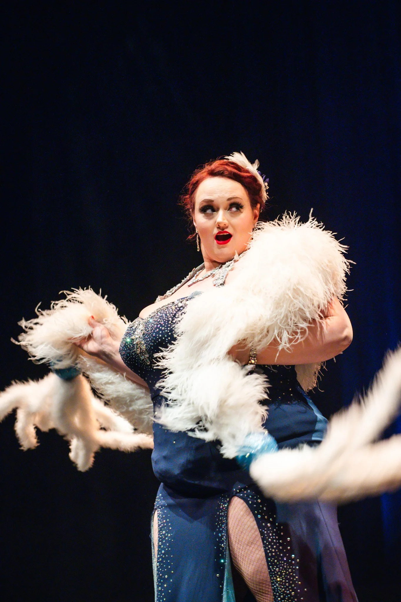 A woman performing on stage, dressed in a glamorous, sequined gown with a high slit, wearing a large white feathered wrap, with red hair styled in vintage waves, and an expressive facial expression.